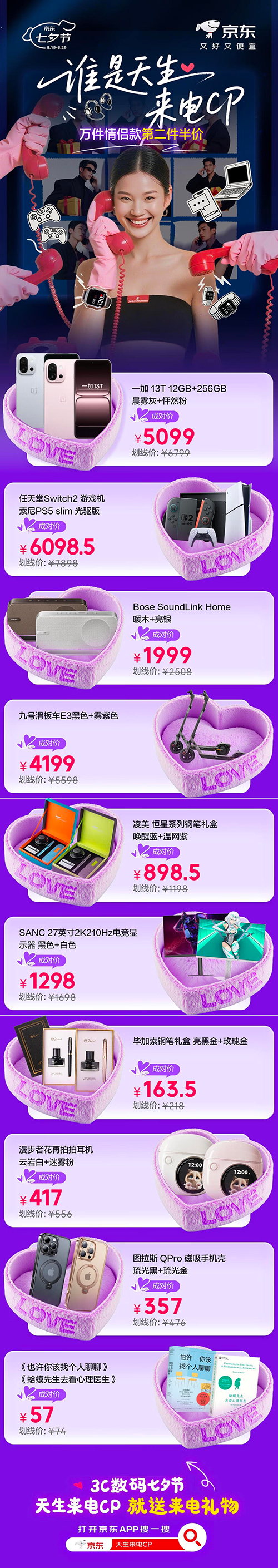 “谁是你的天生来电CP”第二件半价活动火热进行中,多款人气CP组合等你来选:一加13T 12GB+256GB双机组合仅需5099元,畅享高性能移动体验;游戏玩家不可错过的任天堂Switch2游戏机+索尼PS5 slim光驱版畅玩套装优惠价6098.5元,双人畅玩更尽兴;SANC 27英寸2K210Hz电竞显示器黑白双色CP价1298元,并肩作战更畅快;Bose SoundLink Home智能音箱双色组合心动价1999元,让音乐浸润家的每个角落;时尚出行的九号滑板车E3 CP款4199元,开启甜蜜双人旅程。
