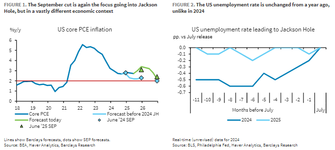 与2024年同期相比,如今的政策利率已低100个基点,核心PCE通胀率略高且预计将加速至3%以上,而失业率保持稳定;7月零售销售数据在向上修正前值后表现稳健,显示消费者支出仍具韧性。此外,金融状况也比一年前更为宽松。